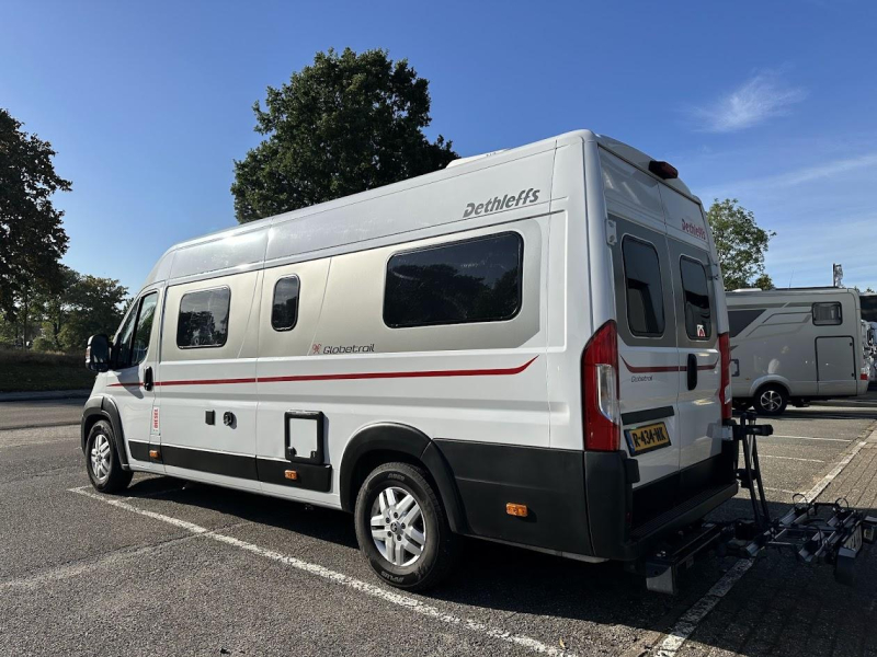 Deze jong gebruikte Dethleffs Globetrail is de eerste buscamper met een lengte van 6.39 m. De lengte wordt gebruik voor een ruim en royaal lengte bed met tegelijkertijd een grote bergruimte onder het bed. Door het bed op te klappen aan 1 zijde is er een 1 persoons buscamper van te maken zonder ruimte verlies door een te groot bed. De mogelijkheid bestaat dan op een fiets binnen in de camper te stallen. U kunt van de dinette een 3e slaapplaats creëren!