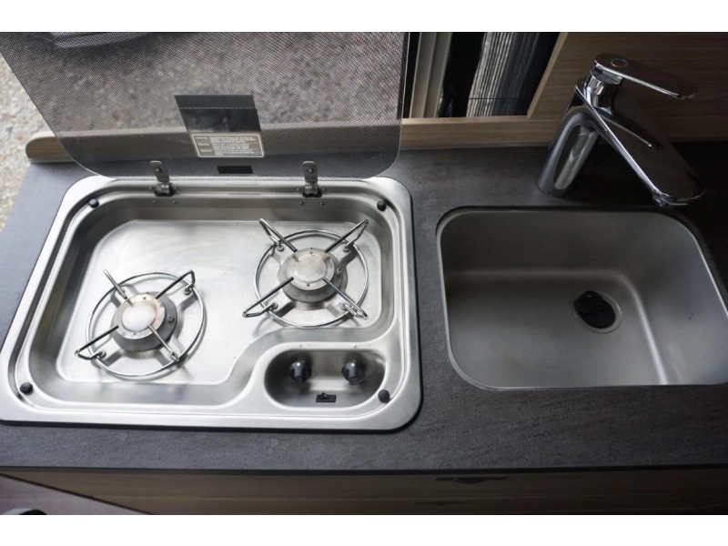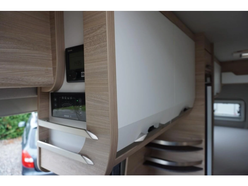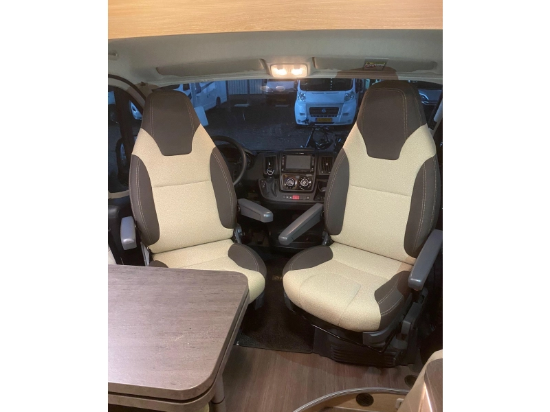 Dinette met draaibare tafel en twee draaistoelen met stoelhoezen, Volledige keuken met koelkast met vriesvak, 2 pits gascomfoor, rvs wasbak, extra werkruimte, lengtebedden (195/190x85) en gastenbed (180x70) Plissé Cabine Verduistering, cruise control, cabine airco, veel kastruimte rondom, 4 gordels, Elektrisch bedienbare ramen en spiegels, rondom combi rollo’s, buitenverlichting.