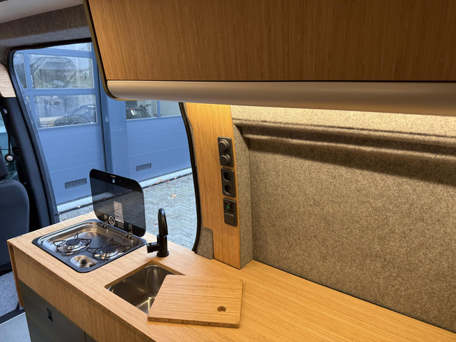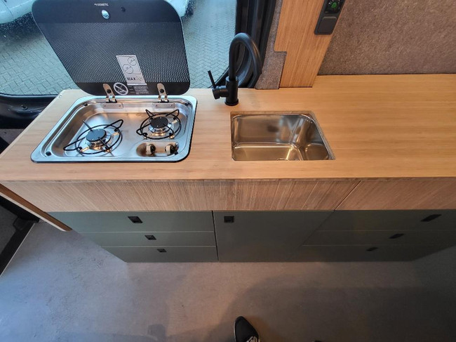 De Leaf 4 heeft aan de bijrijderskant een lange slanke keuken met heel veel kook, spoel en snij oppervlak, een 2 pits Dometic kookplaat en een ruime spoelbak met grote kraan.
