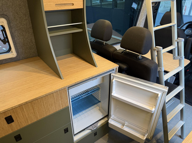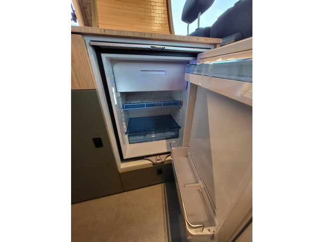 Achter de gekeurde 2de zitrij vind je een fraai vormgegeven kast met daarin een 80 liter koelkast.