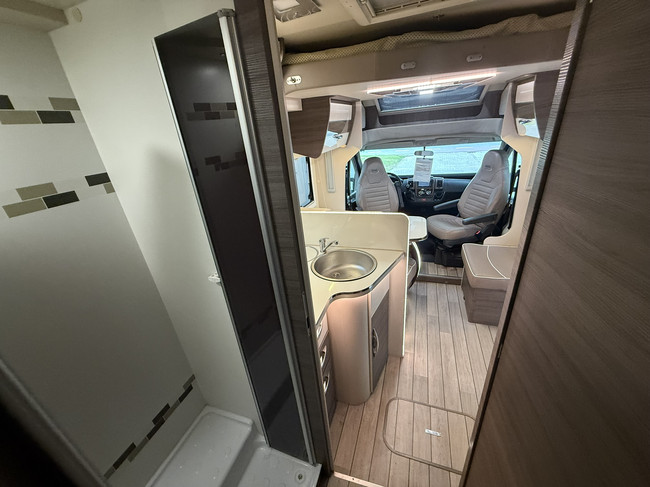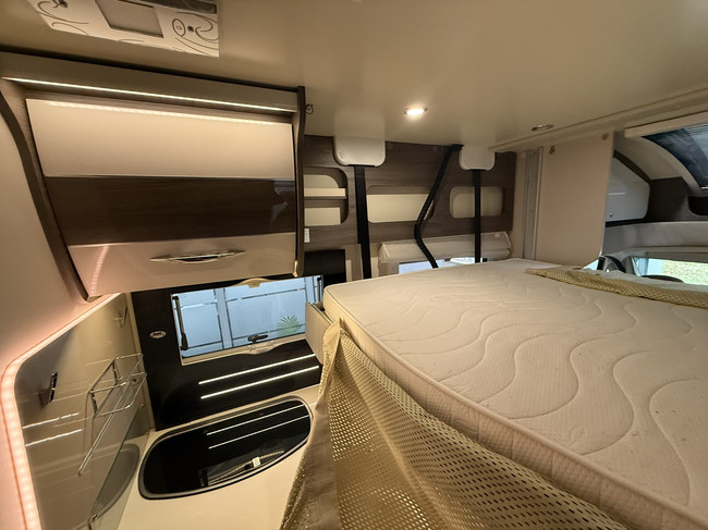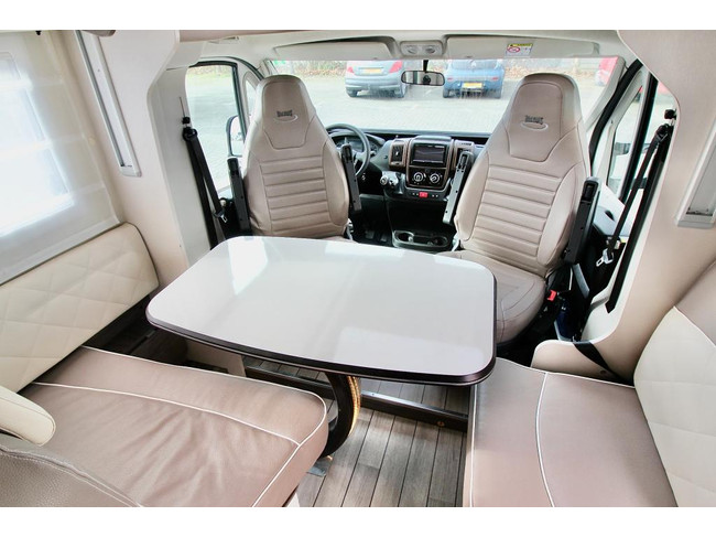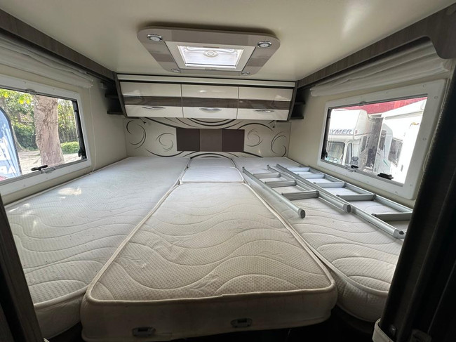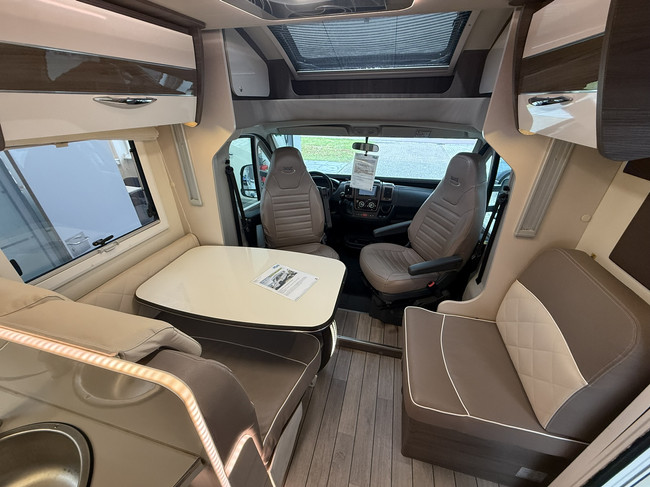 Geniet van een ruime zithoek, comfortabele draaibare cabinestoelen, een gezellige dinette en een lengtebedden (205 x 215 cm met tussenstuk) achterin, op gasveren voor gemakkelijke toegang langs boven tot de bergruimte (legkast en hangkast). Boven de zitgroep bevindt zich een tweepersoons elektrisch hefbed, ideaal voor gasten of (klein)kinderen (of je kleding).