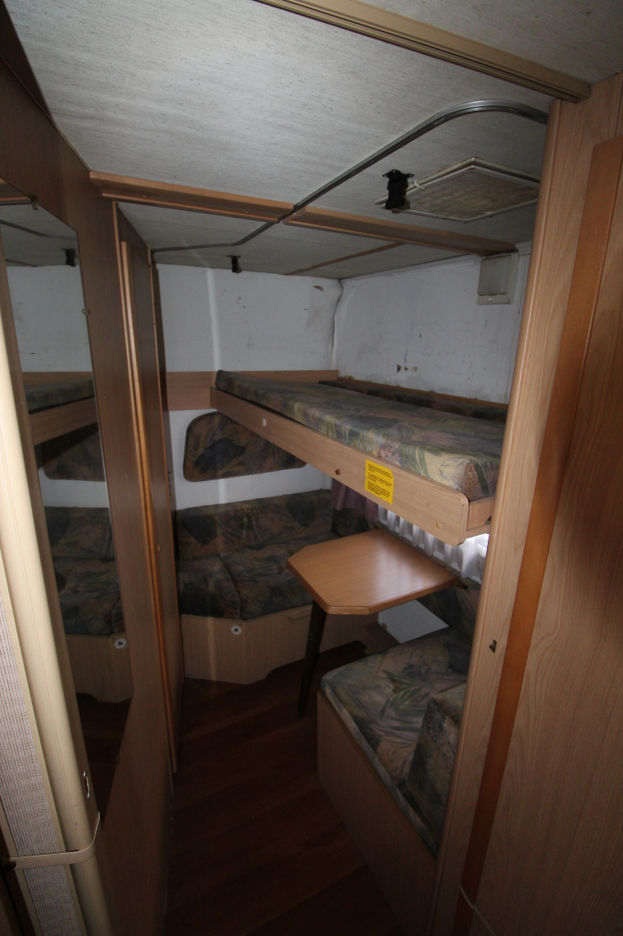 De camper heeft een praktische indeling en is voorzien van een stapelbed achterin, wat hem geschikt maakt voor gezinnen of meerdere slaapplaatsen.