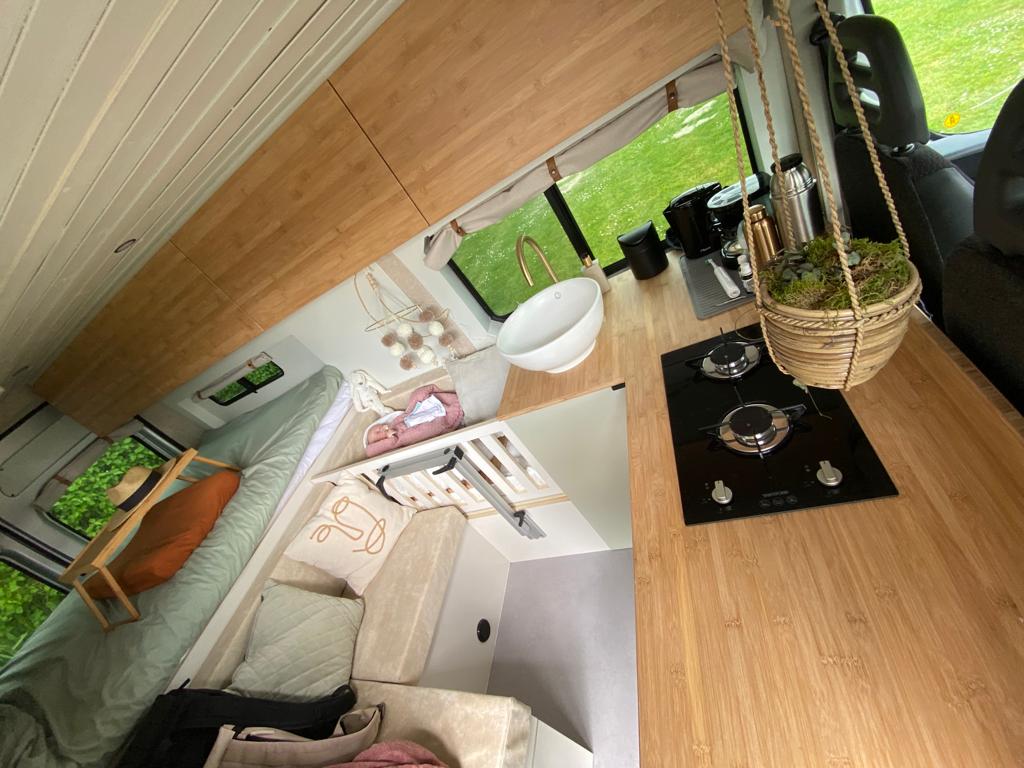 Daarnaast biedt de camper voldoende opbergruimte door de op maat gemaakte bovenkasten.