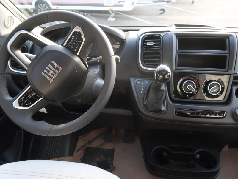 Fiat 140 pk 8 trapsautomaat, cabine zwart/opbouw zilver, Thule 5200 3,5m antraciet, houten douchevlonder, vouwverduistering cabine, 90 liter dieseltank, verhoging 3.650 kg (kan goed op 3.500 kg B-rijbewijs), hefbed voor 2 extra slaapplaatsen, kabelvoorbereiding voor camera en zonnepaneel.