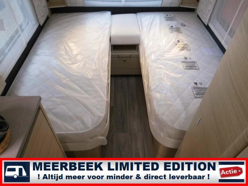 Nieuwe Fendt 2026 caravan. Populaire indeling met enkele bedden en groot voorraam. Veilig AL-KO onderstel. Volautomaat mover. Li-Ion accupack. Thule cassetteluifel. Verschuifbare Enduro fietsendrager.