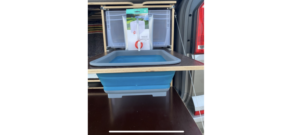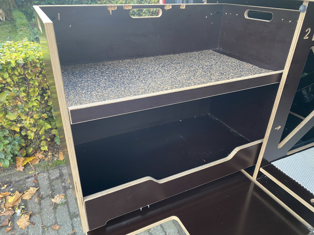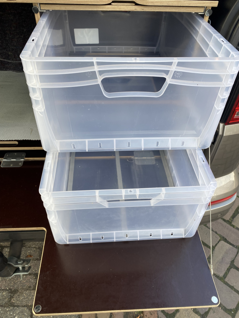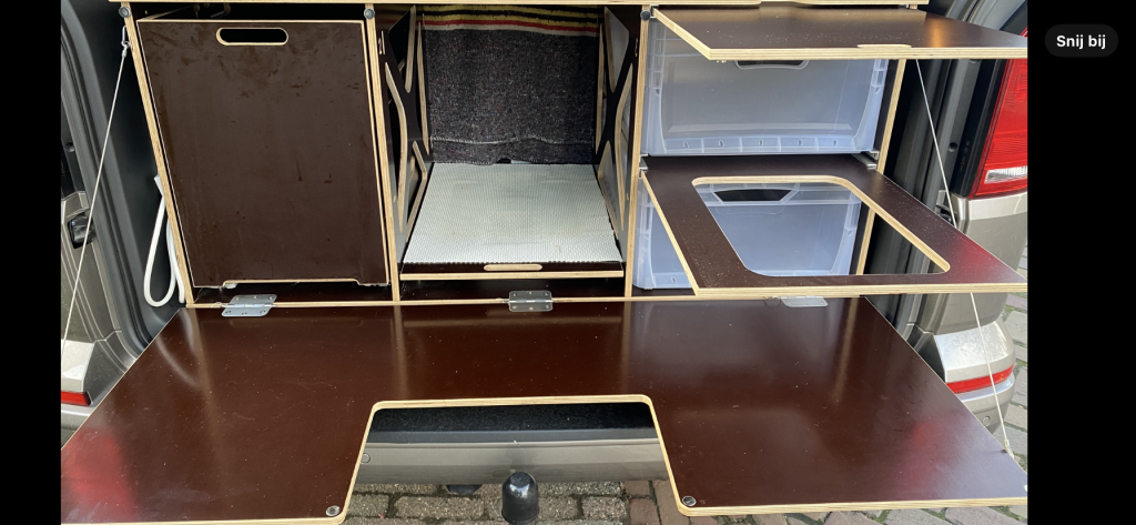 Slimme kampeerbox voor elke VW T 5/6. Unieke plug-in systeem zeer eenvoudig te monteren( en demonteren) gewoon zonder gereedschap( zit vast in de rail met T bouten, exclusief) Als u de kampeerbox langere tijd niet nodig heeft kan deze in afzonderlijke delen worden gedemonteerd en ruimtebesparend worden opgeborgen. Vijf functies: koken, koelen (met losse koelbox, deze is niet inbegrepen) afwassen, opbergen en slapen. De kist is gemaakt van hoogwaardig multiplex. De camperkit is slechts 2 jaar oud en afmetingen zijn: 121 cm breed 62 cm diep en 54 cm hoog. De kit is ons erg goed bevallen met name zodat je meer leefruimte hebt in de bus.